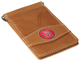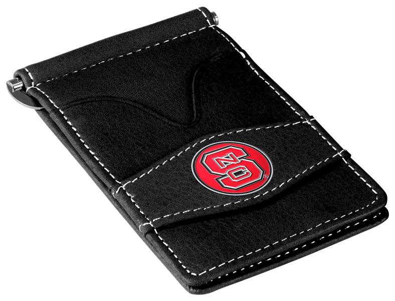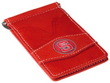 The NC State Wolfpack Player's Wallet is available in an assortment of neutral and NC State Wolfpack colors. Each one features contrast stitching and genuine leather giving it a soft velvet feel with your favorite NC State Wolfpack's college logo prominently displayed on the exterior of the wallet. Each wallet features an exterior ID slot, 4 interior card slots and a swing bar bill clip. The Player's Wallet is a golf accessory you don't want to miss!