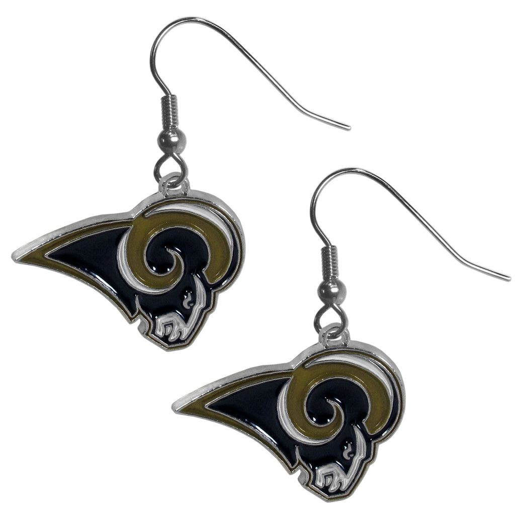 Our officially licensed chrome dangle earrings have fully cast Los Angeles Rams charms with exceptional detail and a hand enameled finish. The earrings have a high polish nickel free chrome finish and hypoallergenic fishhook posts.