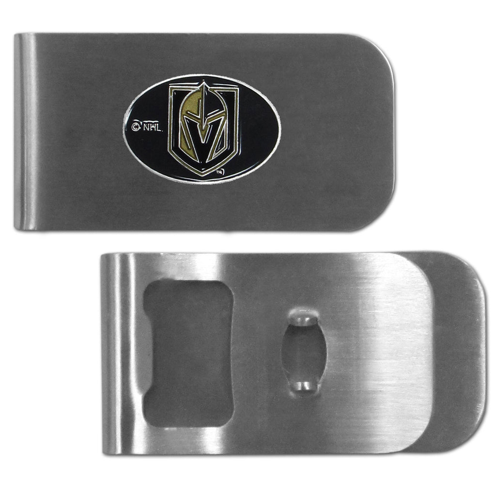 This unique clip features a classic, brushed-metal finish with a handy bottle opener feature on the back. The clip has a metal Vegas Golden Knights® emblem with expertly enameled detail.