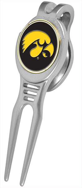 The Kool Tool is a great way to show off your Iowa Hawkeyes spirit on the course. This divot tool includes a high quality removable LinksWalker die-struck, enamel filled ball marker that is magnetically held into place. The divot tool is an all metal construction that clips to your belt or pocket for convenient use.