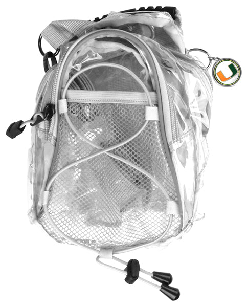 Show your Miami Hurricanes spirit with a clear carry-all for security restricted golfing events! Each Event Day Pack prominently displays the college logo of your favorite Miami Hurricanes on the attached key ring. The stylish day pack is made from clear vinyl, making passing security check points a breeze. It features 3 separate compartments for gear: 2-zippered compartments, a mesh front pocket and laced bungee drawstring. Includes a grab-n-go handle, a strap to wear it over the shoulder, a carabiner clip to easily attach it to your golf bag or wear it on your hip using the belt loop.