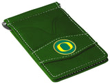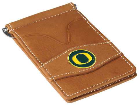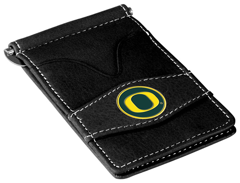 The Oregon Ducks Player's Wallet is available in an assortment of neutral and Oregon Ducks colors. Each one features contrast stitching and genuine leather giving it a soft velvet feel with your favorite Oregon Ducks's college logo prominently displayed on the exterior of the wallet. Each wallet features an exterior ID slot, 4 interior card slots and a swing bar bill clip. The Player's Wallet is a golf accessory you don't want to miss!